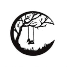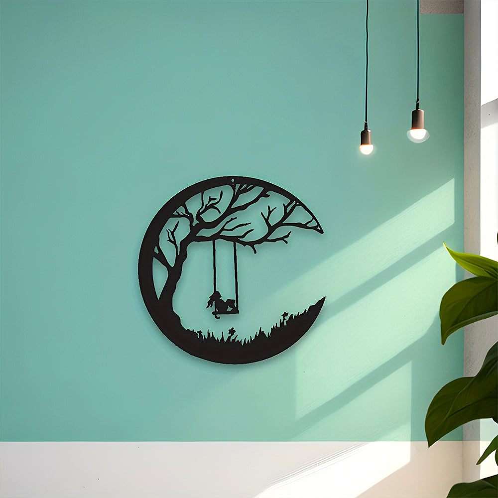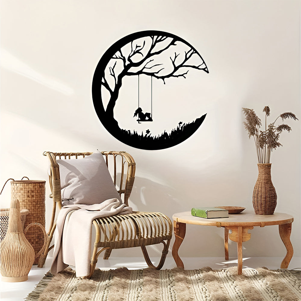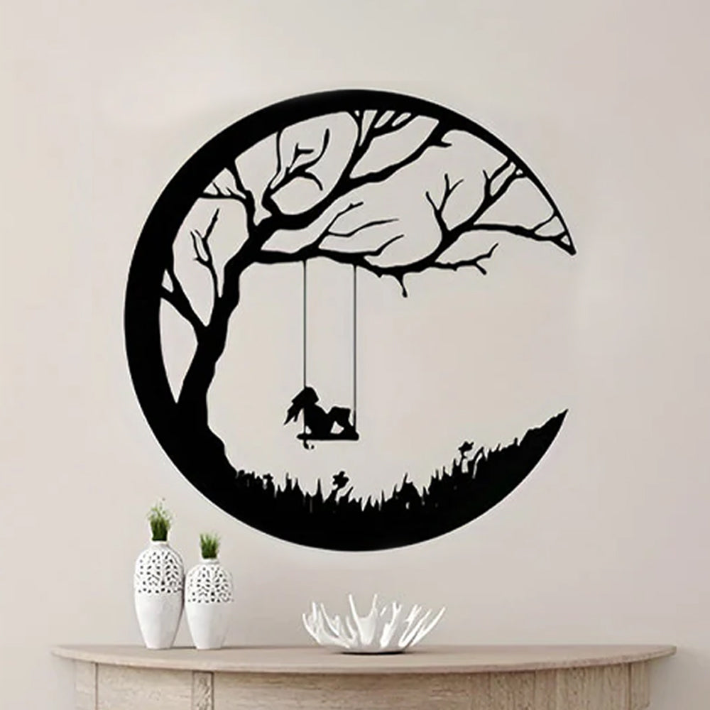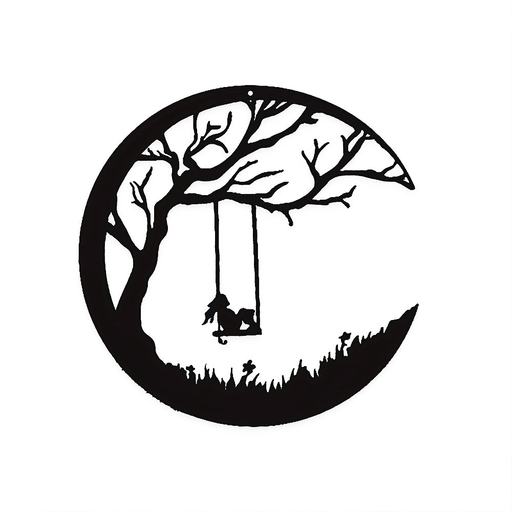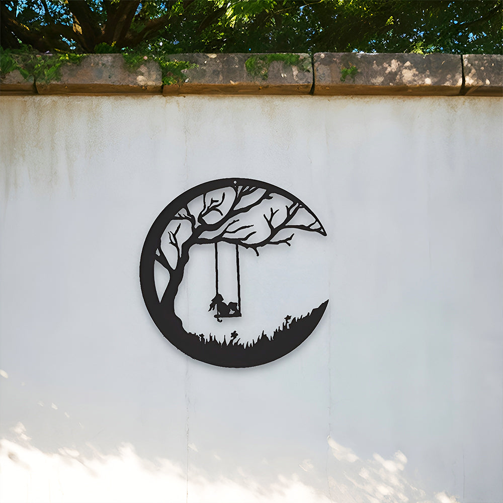 Mond und Wiese Baum mit Schaukel Mädchen Metall Wandkunst Dekoration