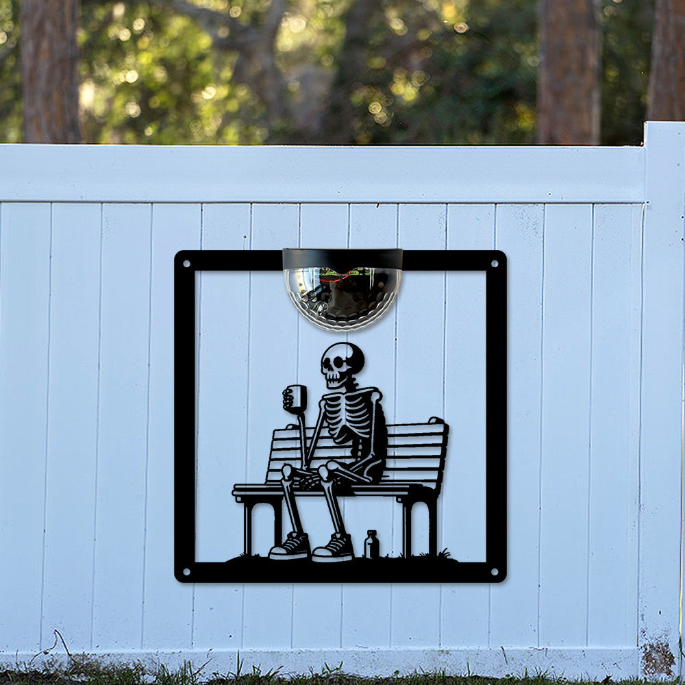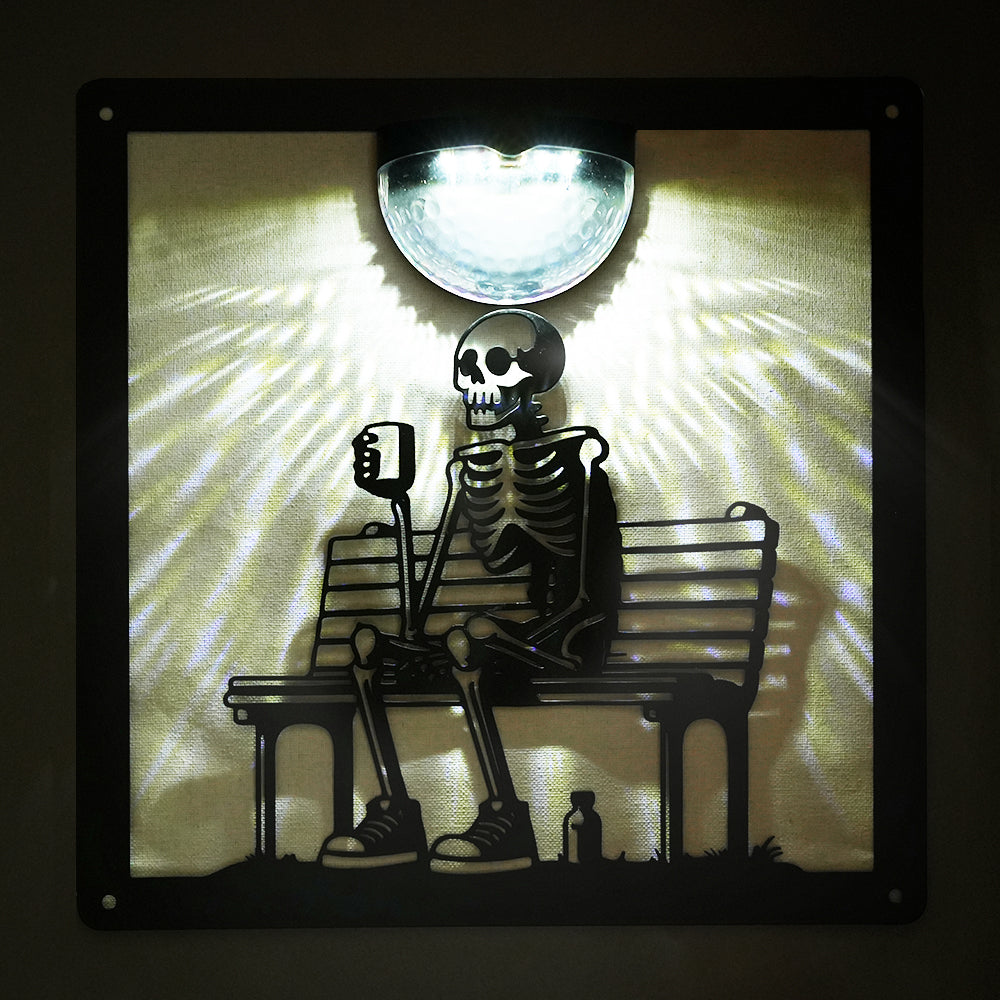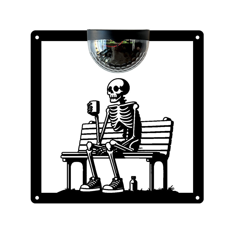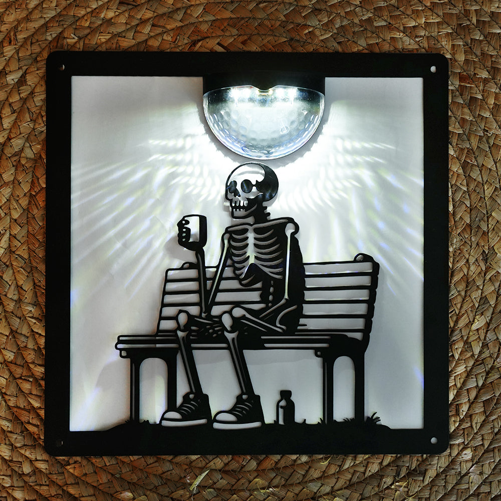 Skelett auf Bank Metall Wandkunst mit Solarlicht Solar Wandtafeln