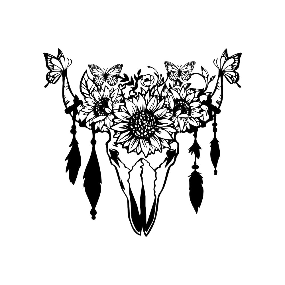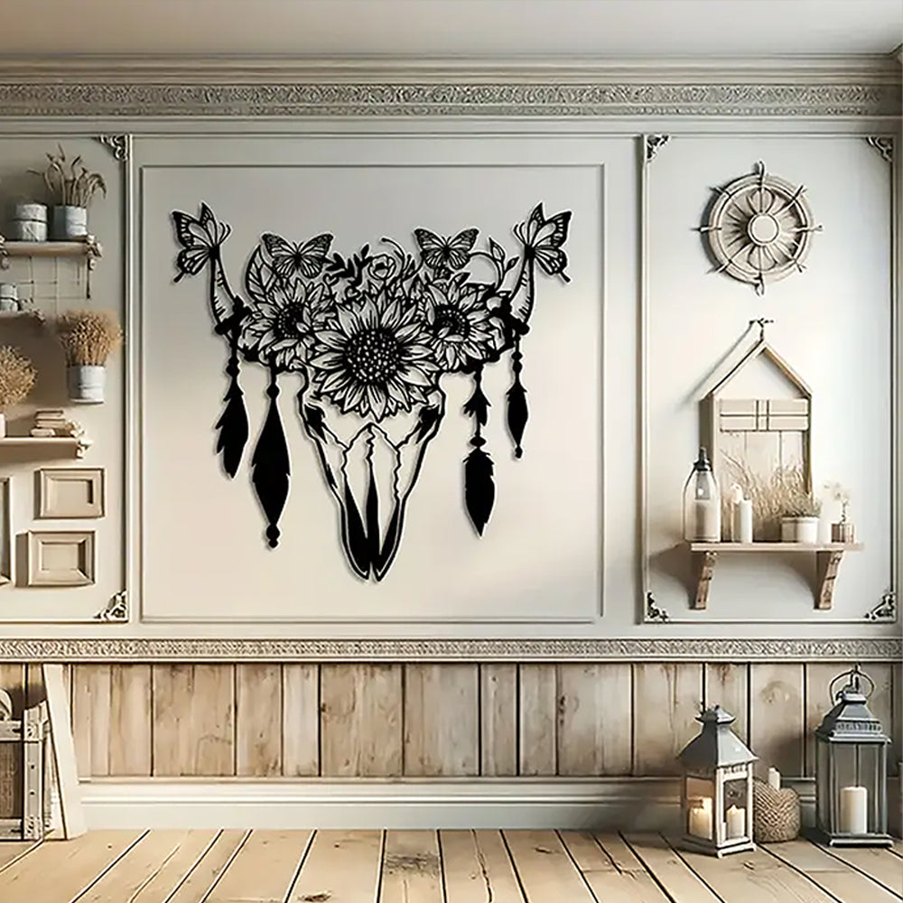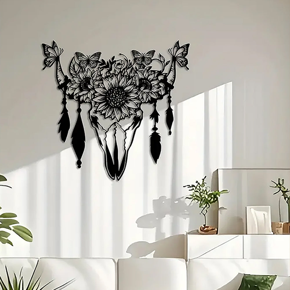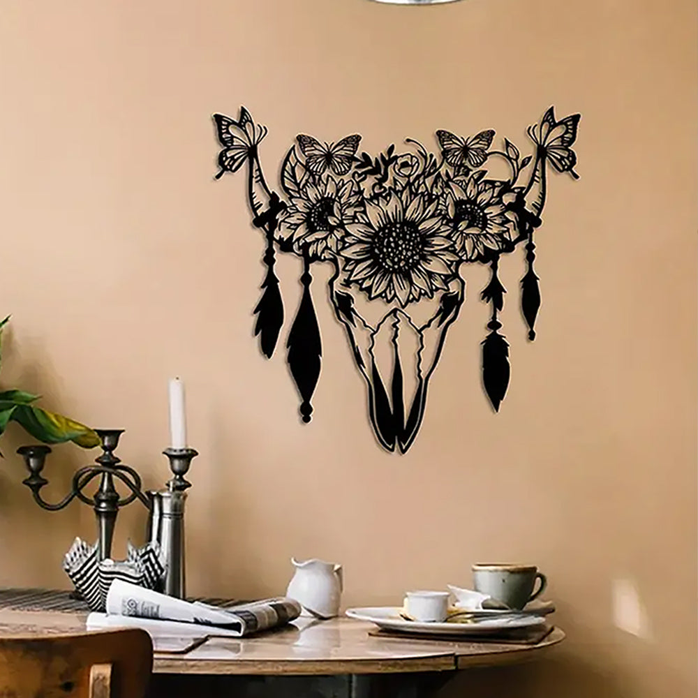 Schmetterling, Sonnenblume und Kuhschädel Metallschild Wanddekoration